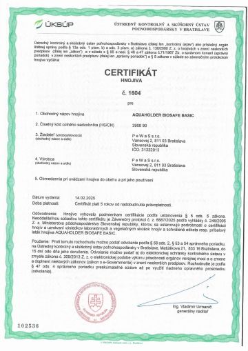 Aquaholder is environmentally neutral - the polymer used decomposes in the soil into CO2, water, ammonia, nitrogen and potassium salt, all substances that could be naturally found in the soil. The active substance is approved by the Central and Testing Institute in agriculture in Bratislava, Slovakia (ÚKSÚP) and is assigned a certificate for the use in agriculture number 1408 from 13.10.2020. The other ingredients used in Aquaholder are also licensed for the use in agriculture.