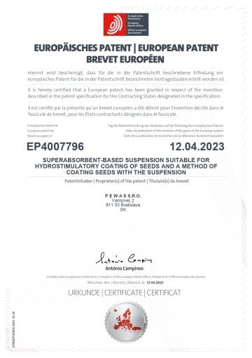 Aquaholder is a highly innovative technology. Its innovativeness is also confirmed by the patent that was granted to Aquaholder in 2023 and is valid in 34 countries around the world. The subject of the patent is the product itself but also the method of applying the product to the seed.